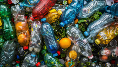 A pile of plastic bottles and other trash on the ground, AI
