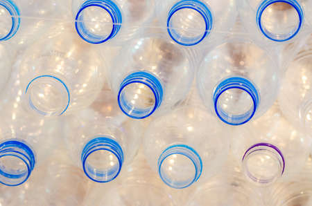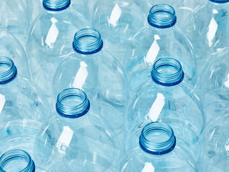 Horizontal color image with a front view of an empty clear plastic bottles with caps stacked on a blue background. Recycling and environment concept.