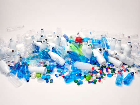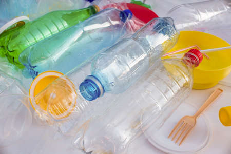 Ecology concept. Multicolored plastic trash on white background