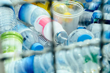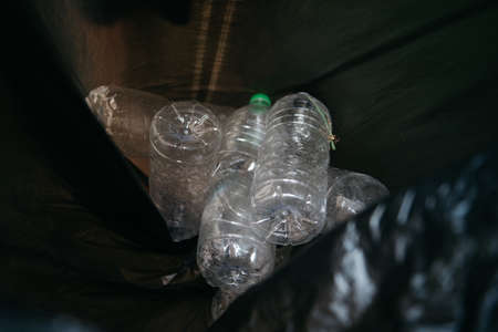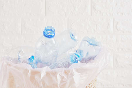 collection of plastic bottles in trash can, garbage recycling concept