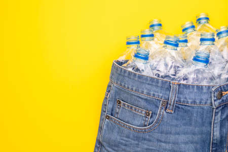 Recycle technology of plastic bottle to make clothes. Top view old water bottle and blue short jeans on yellow background