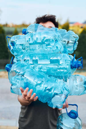 Young man throwing out empty used plastic water bottles into trash bin. Collecting plastic waste to recycling. Concept of plastic pollution and too many plastic waste. Environmental issue