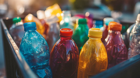 A close-up of colorful plastic bottles arranged in a recycling bin, highlighting the importance of waste management and environmental awareness.