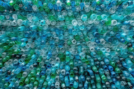 Ocean pollution. Plastic reuse. Waste management. Environmental contamination. Wet clean empty creased bottles pile on blur teal green blue background.