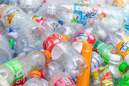 Thailand Bangkok 8 MAR 2020 Plastic pollution concept. Various branded empty soft drinks plastic bottles background