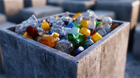 Concrete bin filled with household recyclables, emphasizing civic responsibility