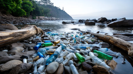 Plastic pollution of the ocean is an environmental problem. Dirty sea beach, garbage on the seashore. A global problem, a threat to ocean wildlife and calling for urgent action to protect the environment