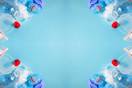 Top view of various kinds of disposable plastic waste on blue background, copy space.
