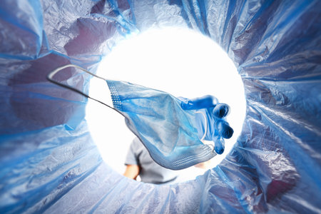 A hand in a blue glove throws a protective medical mask into the trash, a view from the inside of the bucket. Used Disposable surgical mask. Environmental Concept of medical waste disposal and consequences of disease.