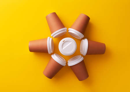 Many white and one brown paper cups, flipped upside down on a light background. Top view, flat lay. Banner.
