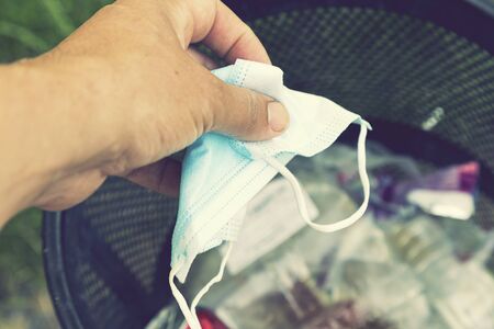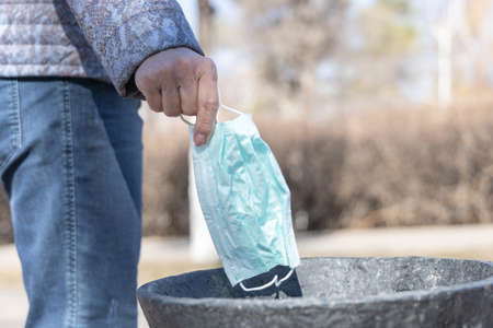 Man throwing face masks into trash in park. Man throwing used surgical mask into recycling bin. Waste disposal problem in coronavirus times, covid-19. Medical face masks.