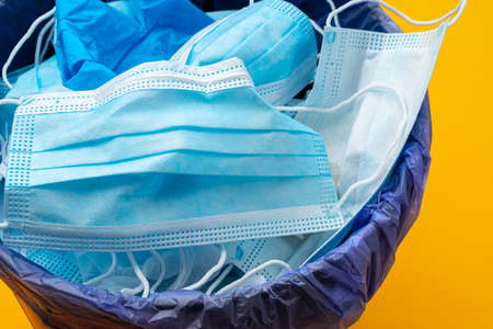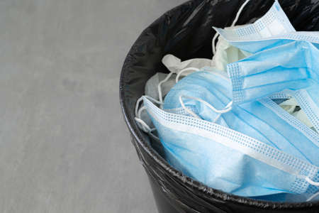 Mask thrown in the trash. Discarded surgical masks. Medical waste with copy space on a blue background. Over of coronavirus, SARS-CoV-2 pandemic.