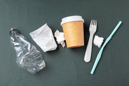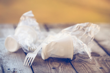 White crumpled plastic dishes in a paper packet on beige background. Concept of Recycling plastic and ecology