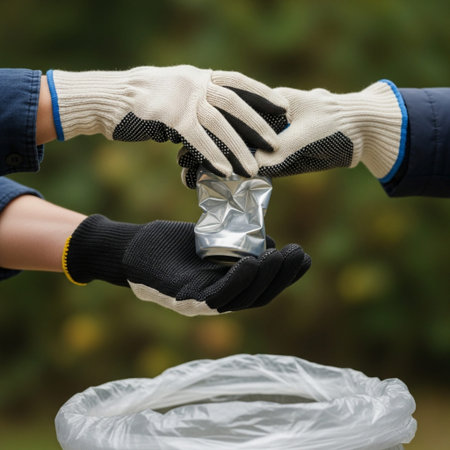 a close-up photo of gloved hands depositing plastic trash into a recycling bin, symbolizing the commitment to environmental sustainability