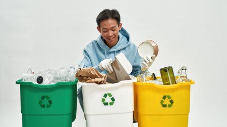 Asian man sorting garbage in variety dustbins