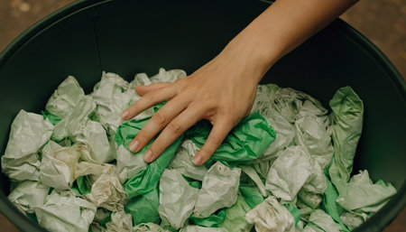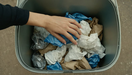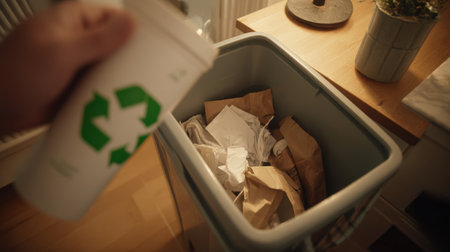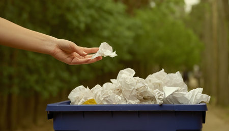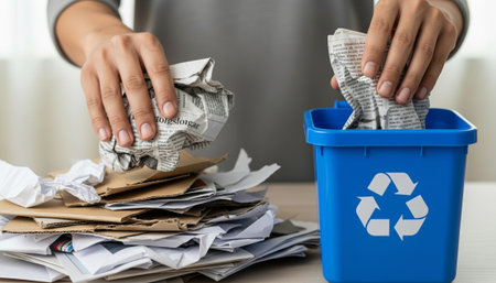 Hands sorting paper waste into a recycling bin, emphasizing environmental sustainability and eco-friendly practices. Clean, no faces, high-quality shot ideal for waste management or green initiatives.