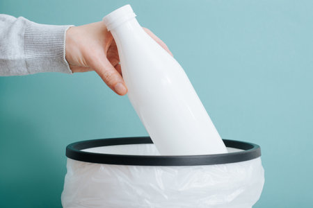 Close-up of hand throwing plastic white bottle of milk into trash can