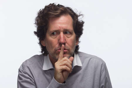 Close up of a serious businessman making a silence gesture, concept for whistleblowing or secrecy