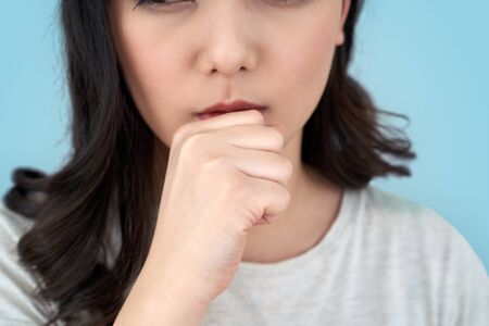 Coronavirus Concept. Chinese woman standing isolated on grey coughing close-up