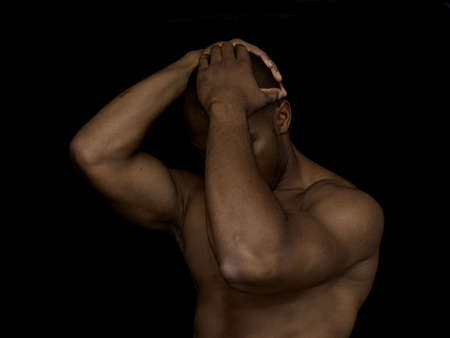 Portrait of a fit African American man in a pose expressing grief.