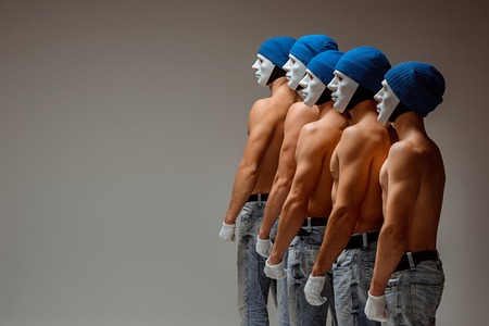 The group of caucasian men in white masks and hats, jeans