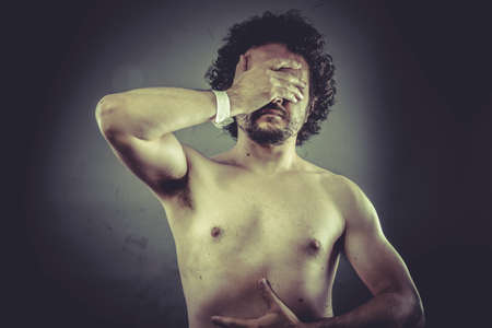 Concept pain, Nude Man with hospital bracelet.