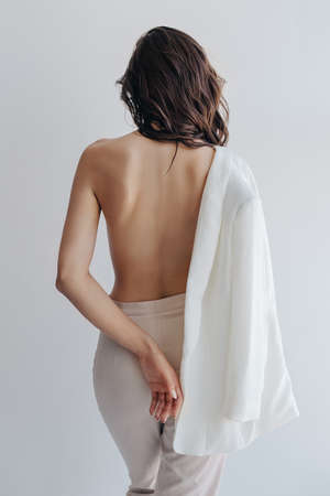 Girl with bare back, jacket on one shoulder and in trousers turned away from the camera and no face visible