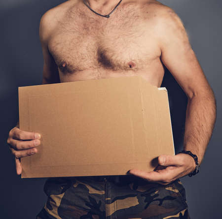 Shirtless man with sign in front of belly