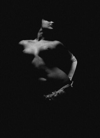 Woman's breast with cotton in the dark. Photo of a woman in shadow.