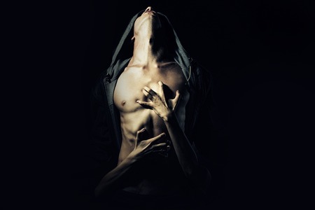 Close-up of perfect male body isolated on black background with copy space
