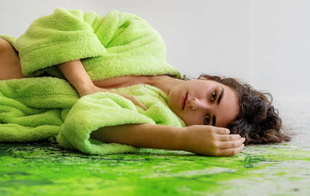 young sexy sensual seductive woman in a green bathrobe lies on a large green patch of paint on the floor of the artist's studio