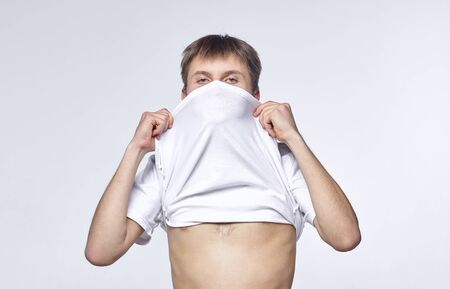 Fat man does not wear a shirt,overweight man trying on cloth ,on white backgroun, copy space