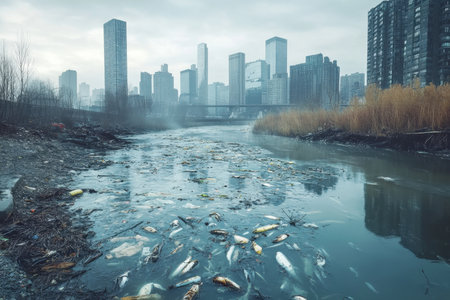 This image showcases a polluted urban river filled with dead fish against a backdrop of towering skyscrapers, highlighting pressing environmental issues and urban decay.