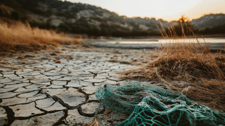 A dry lakebed exhibits cracked clay with hints of moisture, showcasing abandoned fishing nets amidst a somber atmosphere at sunset.