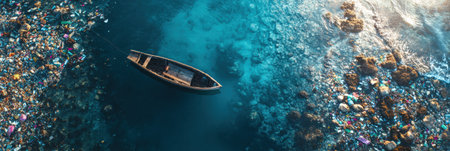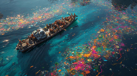 A boat navigates through a sea filled with various types of trash and colorful debris under clear blue skies.