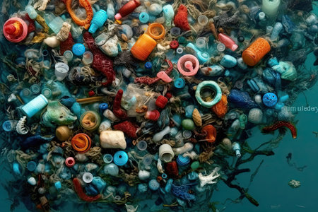 Plastic pollution in the ocean, view from above. Tons of plastic ends up in the ocean each year. AI-generated image, environmental issues