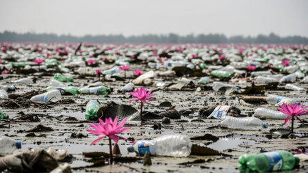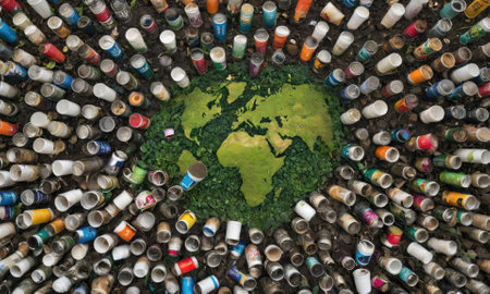 A striking depiction of pollution featuring plastic bottles and other waste amidst vibrant greenery, highlighting the importance of environmental care and awareness.