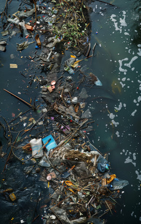 Trash seen in polluted ocean waste floating in illuminated waters image. Concept Polluted Ocean, Trash in Water, Pollution Awareness, Ecological Impact, Marine Environment