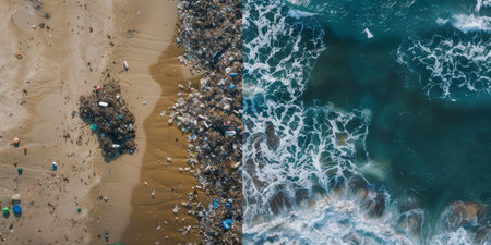 This aerial view captures the alarming accumulation of plastic waste along a beach, highlighting environmental pollution and its impact on nature.