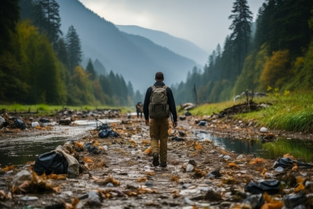 Male volunteer walks in forest near mountain river and collects garbage, plastic bottles and bags