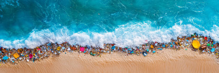 Colorful plastic garbage polluting a beautiful sandy beach with an incoming tide washing more debris ashore, highlighting environmental damage and the urgent need for sustainability