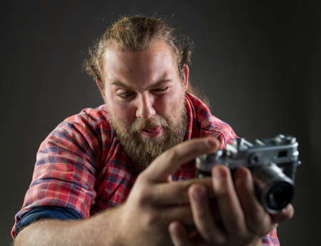 Young bearded man making funny facial expression while taking a photo with old-fashioned camera.