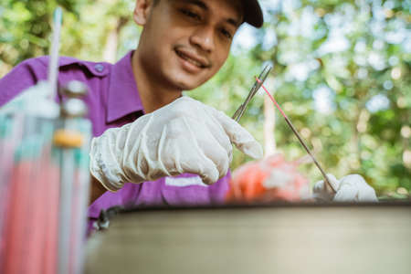 Laboratory technician using tweezers
