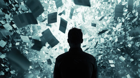 A man's face is obscured by a cloud of glowing particles. Concept of mystery and wonder, as if the man is experiencing a moment of deep thought or contemplation