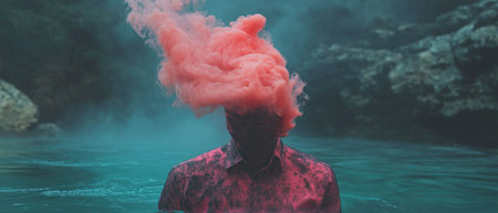 A man is standing in front of a blue background with smoke coming out of his mouth. The smoke is creating a hazy effect, making the man look like he is in a dream or a surreal world