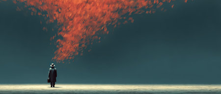 A man in a dark coat stands alone gazing up as vivid red leaves spiral downward from a cloudless dark sky creating a mesmerizing sight.