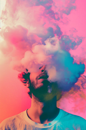 A man is smoking a cigarette and the smoke is coming out of his mouth. The image has a colorful and vibrant feel to it, with the smoke and the man's face being the main focus