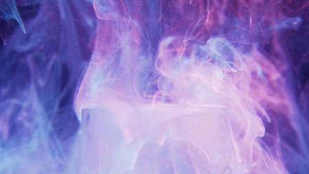 Iridescent glow background. Neon glitter fluid. Dreamlike illusion. Fluorescent pink purple blue color shiny ink water splash on ice cube on mist cloud abstract texture.