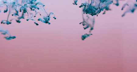 Blur color drip. Smoke splash. Turquoise blue dye blobs in defocused pink fluid. Paint pigment blend flow abstract background free space.