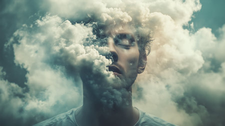 a surreal portrait of a man whose face is partially obscured by clouds, creating a dreamy atmosphere.